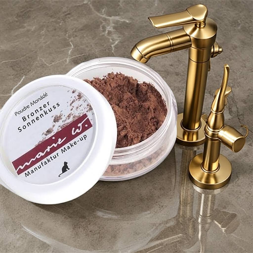 2. Dann mit einem frischen Make-up- Pinsel maximal ½ Messerspitze Bronzer Sonnenkuss in das marie.w Puderschälchen streuen und in den Pinsel einklopfen.