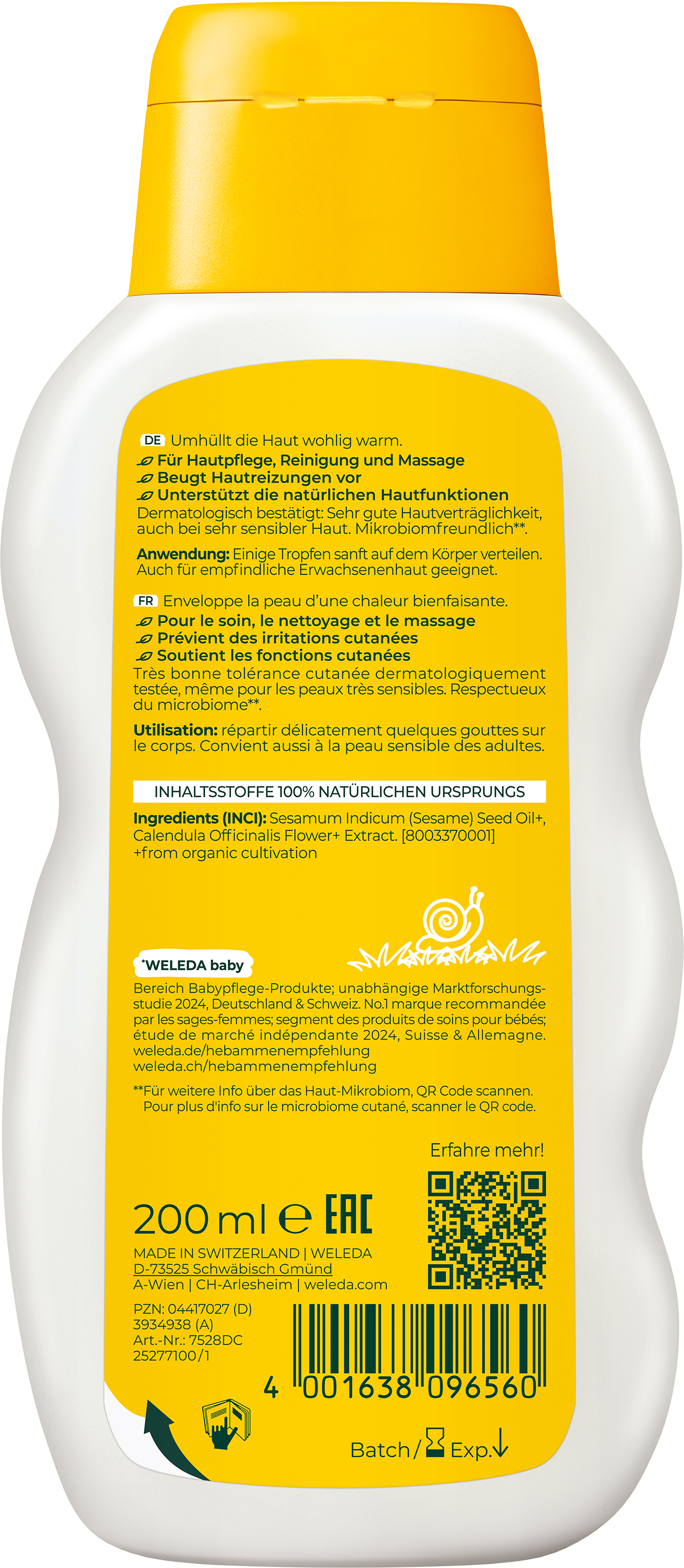 Das unparfümierte Weleda Calendula-Pflegeöl ist ideal für die tägliche Hautpflege und die milde Reinigung im Windelbereich. Es hilft mit einem Auszug aus kontrolliert-biologisch angebauter Calendula, Hautreizungen und Wundwerden vorzubeugen. Durch das enthaltene Sesamöl aus kontrolliert-biologischem Anbau wirkt das Calendula-Pflegeöl wohlig wärmend und ist daher auch sehr gut für die sanfte Babymassage geeignet. Dafür einfach eine kleine Menge Öl auf den Handflächen verteilen und mit kreisenden Bewegungen in die Haut einmassieren.