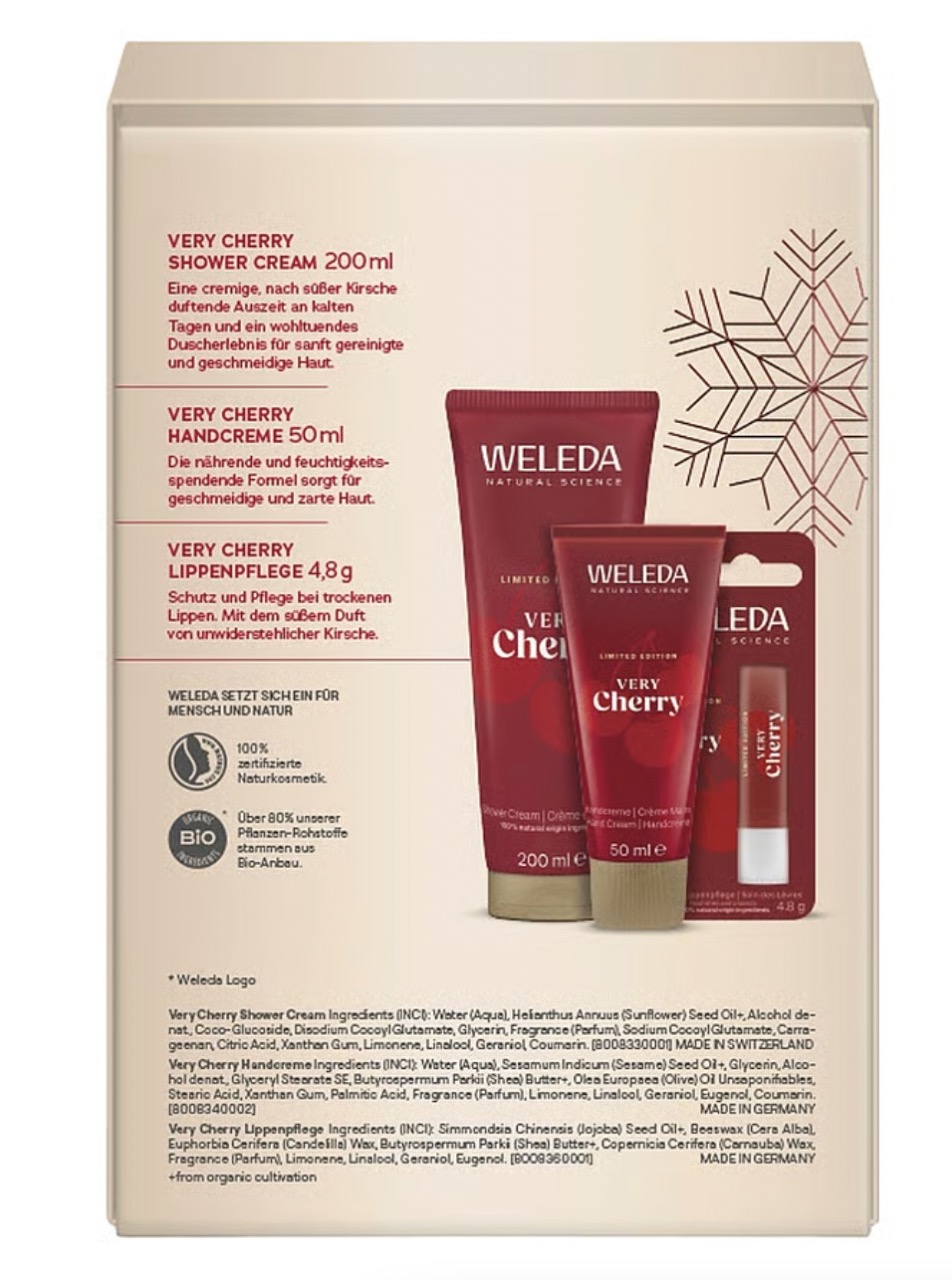 Das Geschenkset Limited Edition Very Cherry verzaubert mit der verspielten Eleganz der dunklen Kirsche. Sahnige Dusche, feine Handcreme und eine Lippenpflege zum Anbeißen gut. Koste davon, solange die limitierten Produkte erhältlich sind!