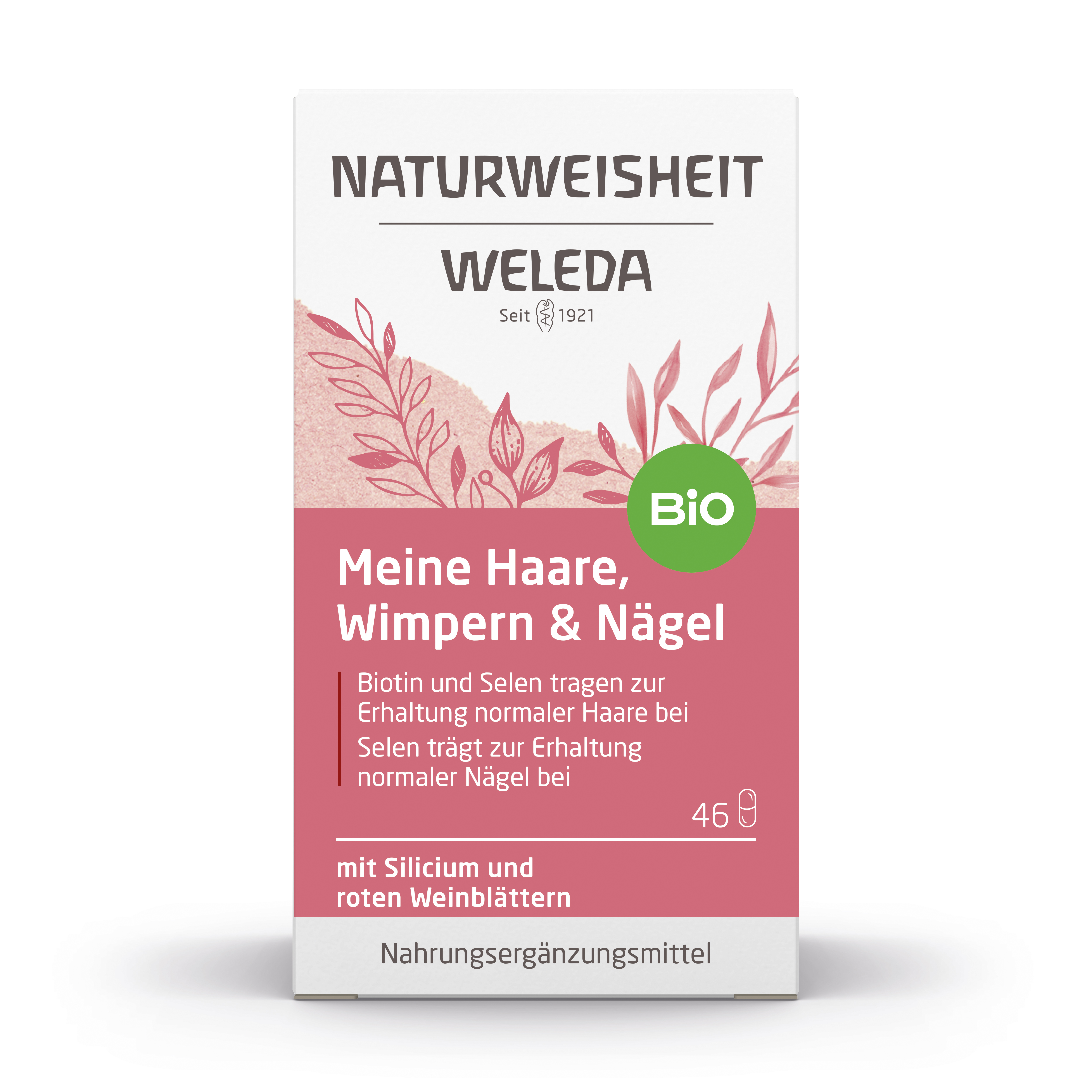 Meine Haare, Wimpern & Nägel ist ein Nahrungsergänzungsmittel mit Silicium, Biotin und Selen aus natürlichen Quellen, Granatapfel, Roten Weinblättern und Hirse.