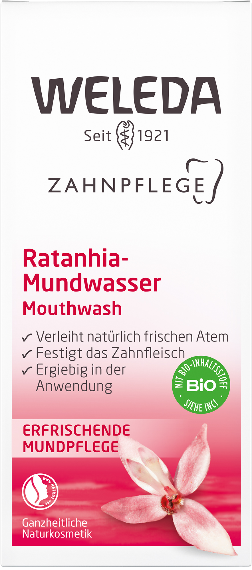 Das Ratanhia Mundwasser regt durch äthe rische Öle und mineralische Substanzen die natürlichen Funktionen der Mundschleimhaut an, hält die Mundflora im Gleichgewicht und sorgt für frischen Atem. Auszüge aus der peruanischen Ratanhiapflanze und Myrrhe kräftigen das Zahnfleisch und die Mundschleimhaut und helfen so, Irritationen vorzubeugen. Das Ratanhia Mundwasser ist ein Konzentrat und daher sehr ergiebig.