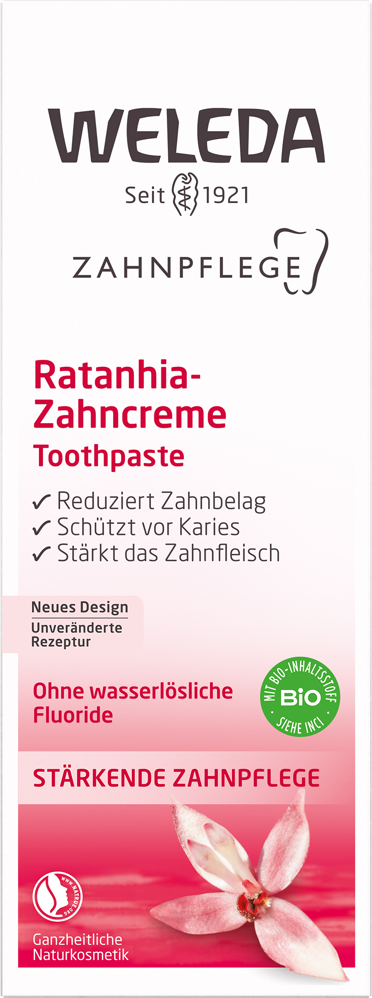 Die erfrischende Weleda Ratanhia-Zahncreme mit einem mineralischen Putzkörper aus Calciumcarbonat (Kreide) reinigt die Zähne sanft und gründlich. Regelmäßiges Putzen mit der Ratanhia-Zahncreme entfernt Zahnbelag gründlich und schützt so zuverlässig vor Karies.